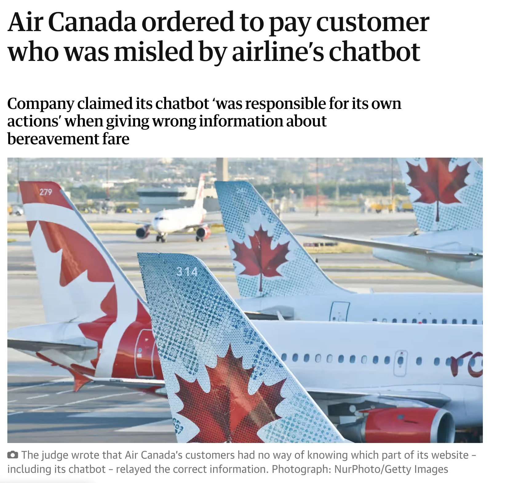In July 2022, Air Canada made headlines for all the wrong reasons when its AI-powered chatbot misinformed a customer about bereavement fares. The bot told a man he could retroactively apply a discount after purchasing his ticket for his grandmother's funeral. But when he contacted support for reimbursement, the airline refused, and claimed the bot was a "separate legal entity that is responsible for its own actions". The issue escalated to small claims court, where the judge ruled against the airline, and stated that Air Canada is responsible for all information provided by its chatbot. The company had to reimburse the ticket and pay damages.