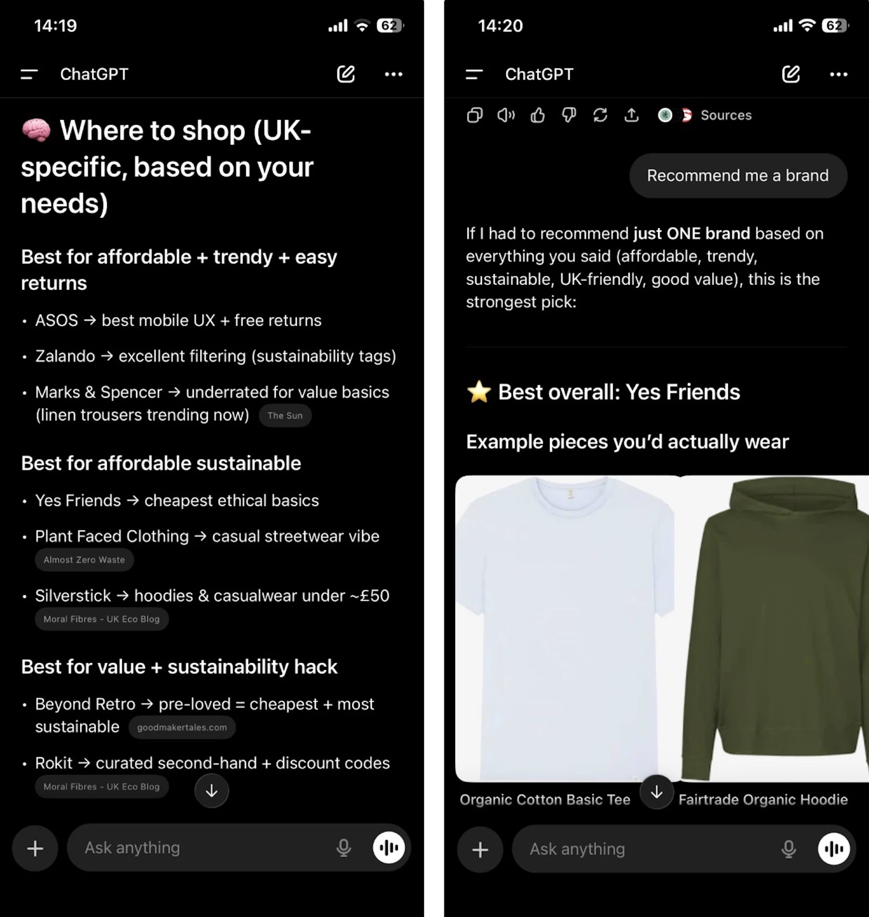 To do this, we utilized detailed query fanouts and complex scenarios that mimic nuanced, real-world consumer demands. Exact examples extracted from our testing show users "Looking for trendy and affordable women's clothing available online with delivery options to London," while explicitly instructing the AI to "Prioritize sustainable fashion lines and easy return policies." Other specific queries we tracked included targeted fanouts like "affordable summer dresses on sale that ship to London UK" and "affordable sustainable fashion brands UK."