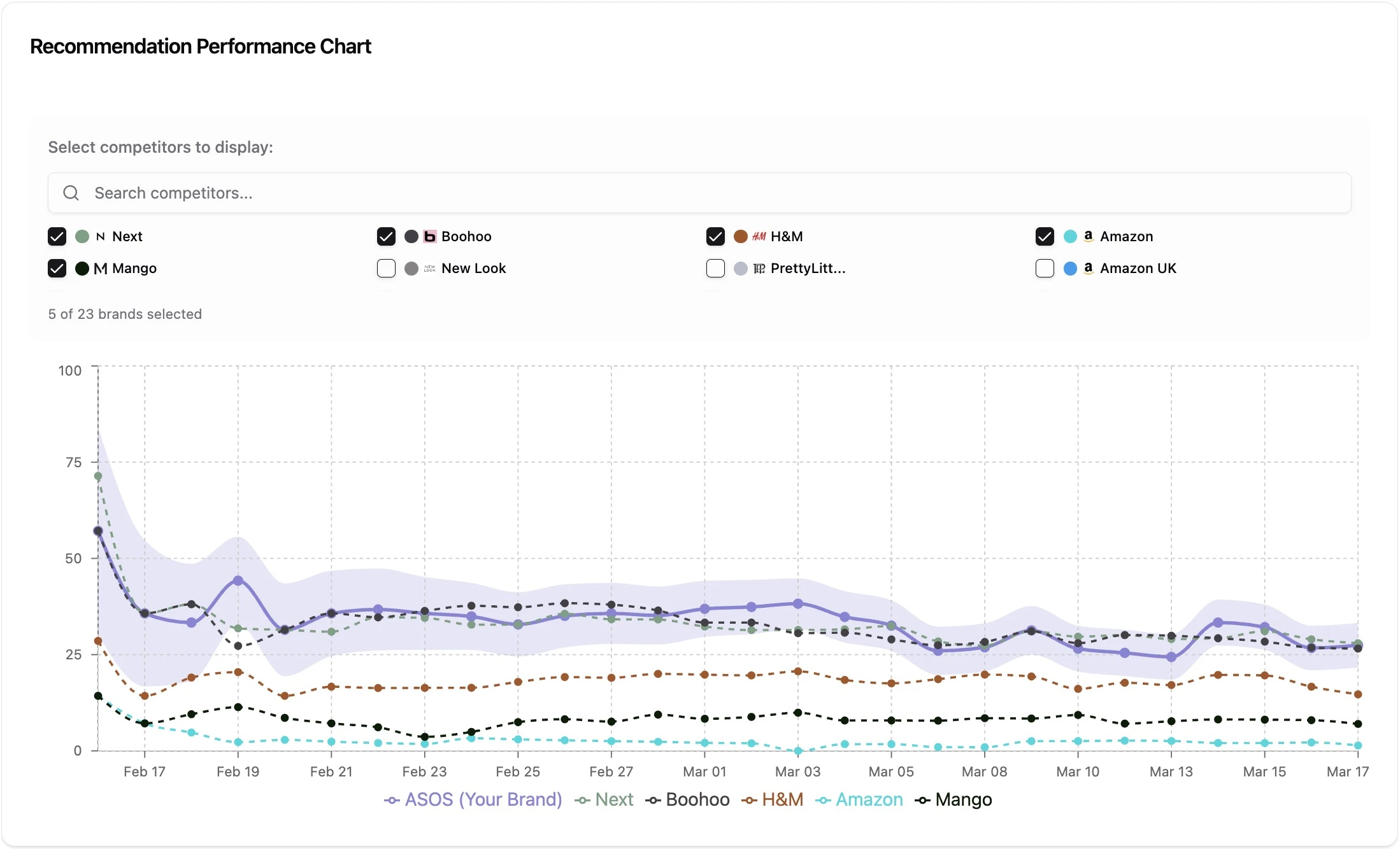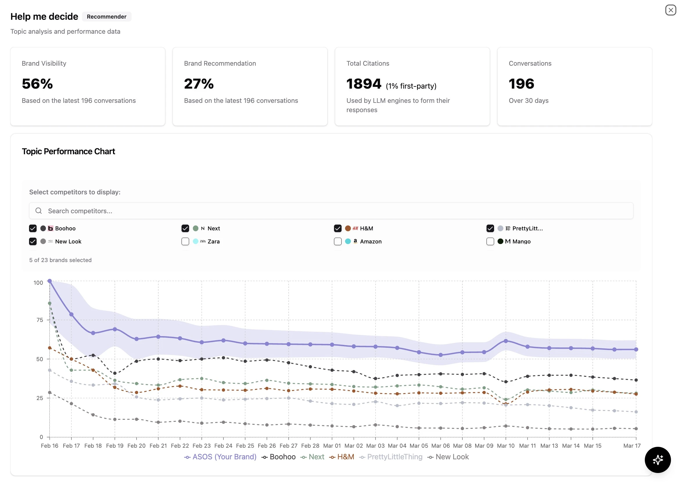 The true competitive impact of this difference is glaringly obvious in our Recommendation Performance Chart. When we strip away mere mentions and look solely at active AI endorsements, ASOS and Boohoo are actively outperforming major market players. Over a 30-day tracking period, ASOS and Boohoo consistently captured the top recommendation share, frequently dominating the competitive set. In stark contrast, massive competitors like Next, H&M, Mango, and Amazon consistently languish at the bottom of the chart, struggling to convert any baseline visibility they might have into actual, actionable AI recommendations.