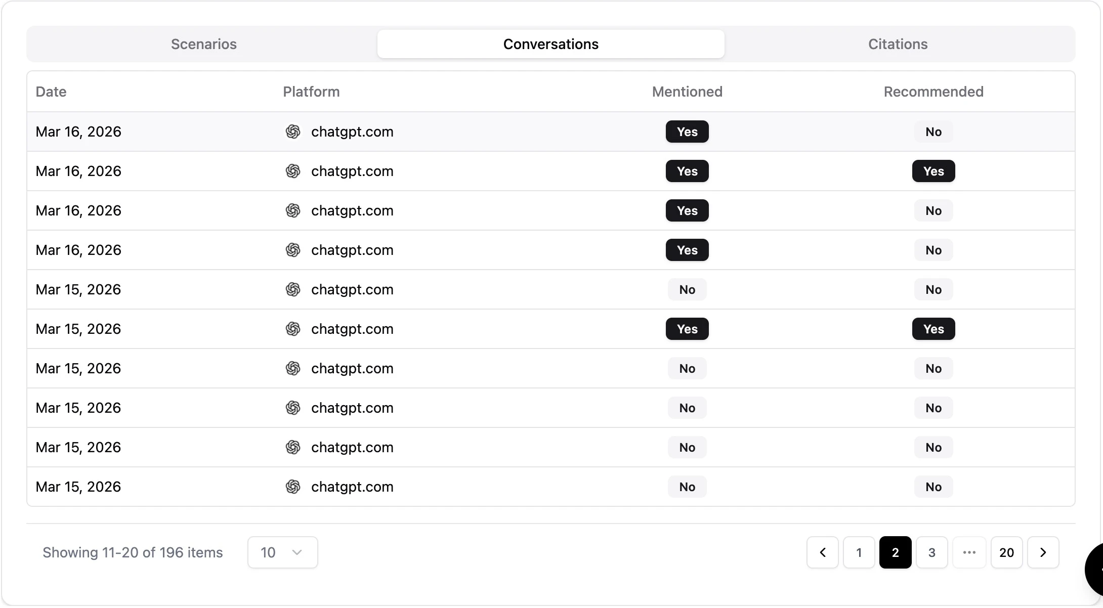 When analyzing the 'Conversations' tracking data triggered by these prompts on platforms like ChatGPT, a crucial discrepancy immediately emerges. Our tracking logs reveal numerous instances where a brand's status registers clearly as "Mentioned: Yes" but crucially, "Recommended: No." This phenomenon happens when the AI brings a brand into the user's context window, acknowledging that it exists within the requested category, but firmly refuses to actively endorse it as the right choice. The AI might list the brand neutrally, but it holds back the definitive recommendation because the brand's data regarding the user's specific constraints (like sustainability initiatives or return policies) isn't strong enough to warrant trust.