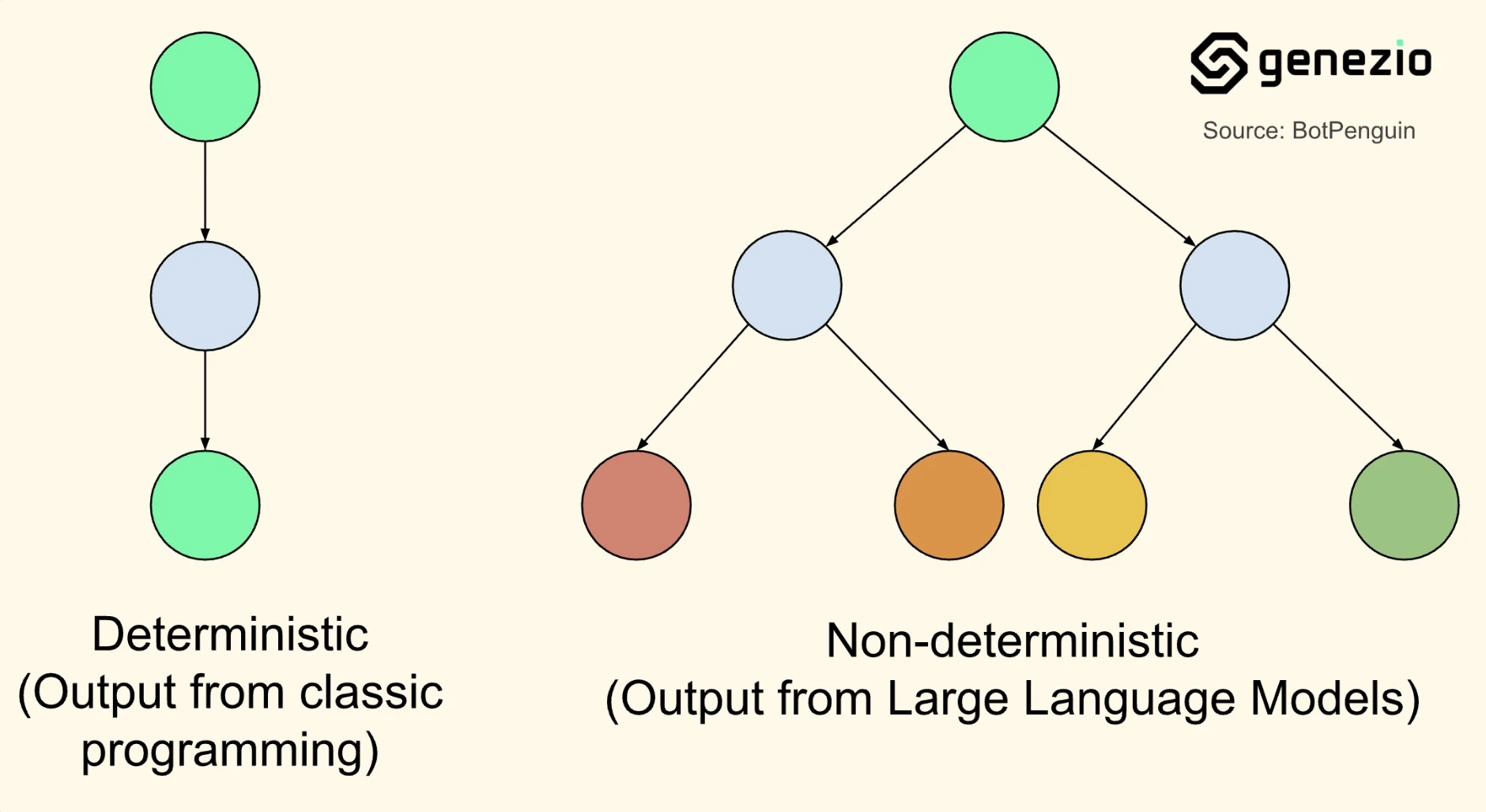 A comparison of Deterministic (classic programming) vs. Non-deterministic (Large Language Models) outputs. Source: BotPenguin